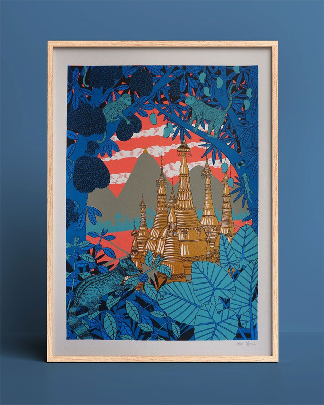 Voyagez au coeur de l'Asie et de sa nature luxuriante et étrange. Des fruits exotiques, des singes farceurs et une civette gourmande cachée dans les feuillages, un serpent, un lézard aux aguets et plein d'autres détails sont à découvrir du regard dans cette sérigraphie aux couleurs éclatantes qui vous emmène au coeur d'un paysage fantasmé entre Birmanie et Laos. Le soleil se couche derrière les montagnes, faisant luire les ors d'une pagode de ses derniers rayons dorés.